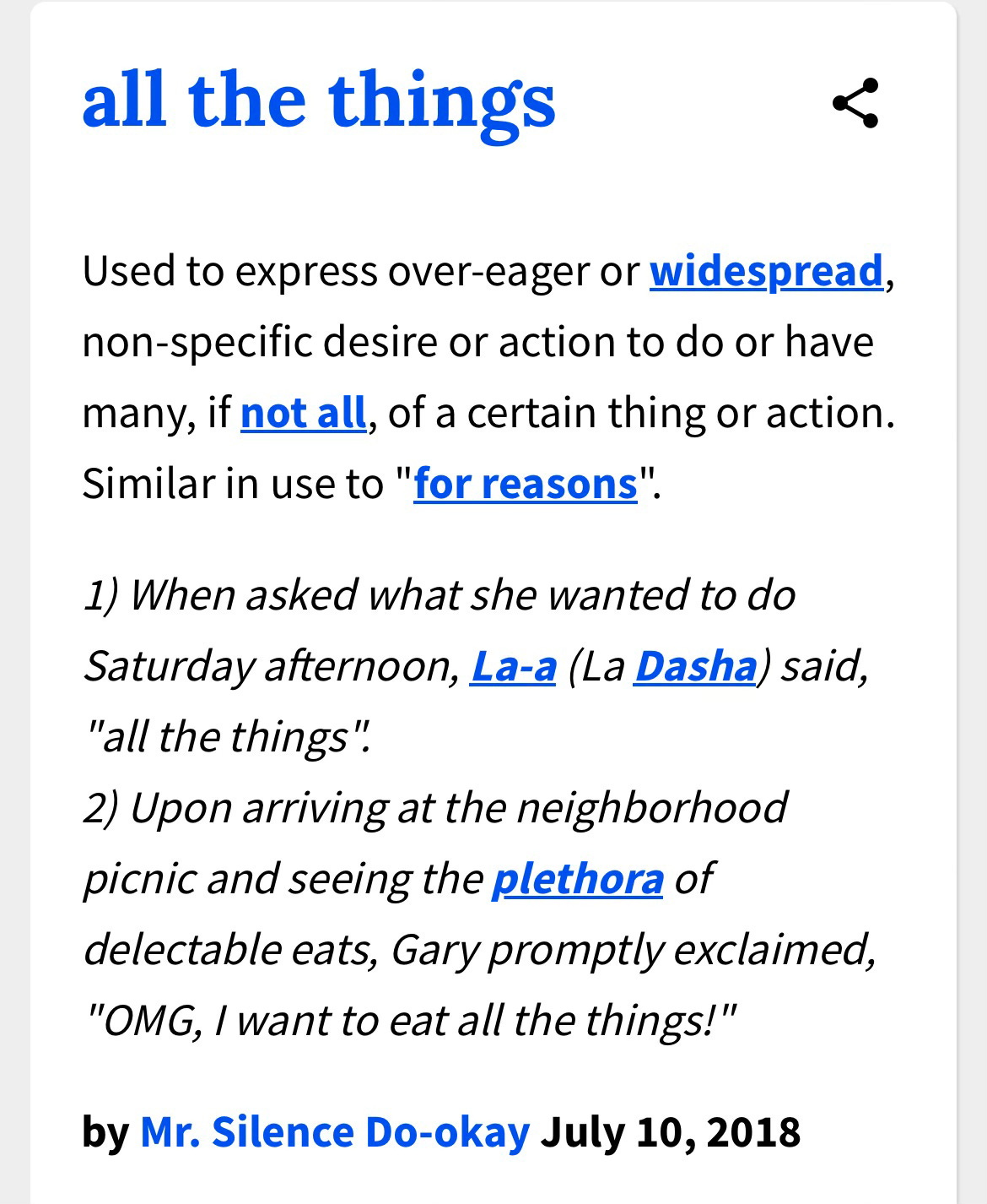 It also seems to imply that the other person will understand I exactly what I mean. I am assuming they will know what “all of the things” are—what they include or do not include. And given that people always nod vigorously in agreement when I say it (I know I do when someone else says it), it would seem that they do know. Or maybe they have no idea what I mean and are filling in the blanks with whatever “all the things” means to them. Does that mean we are constantly talking about completely different things without even knowing it? Maybe. Maybe not.
