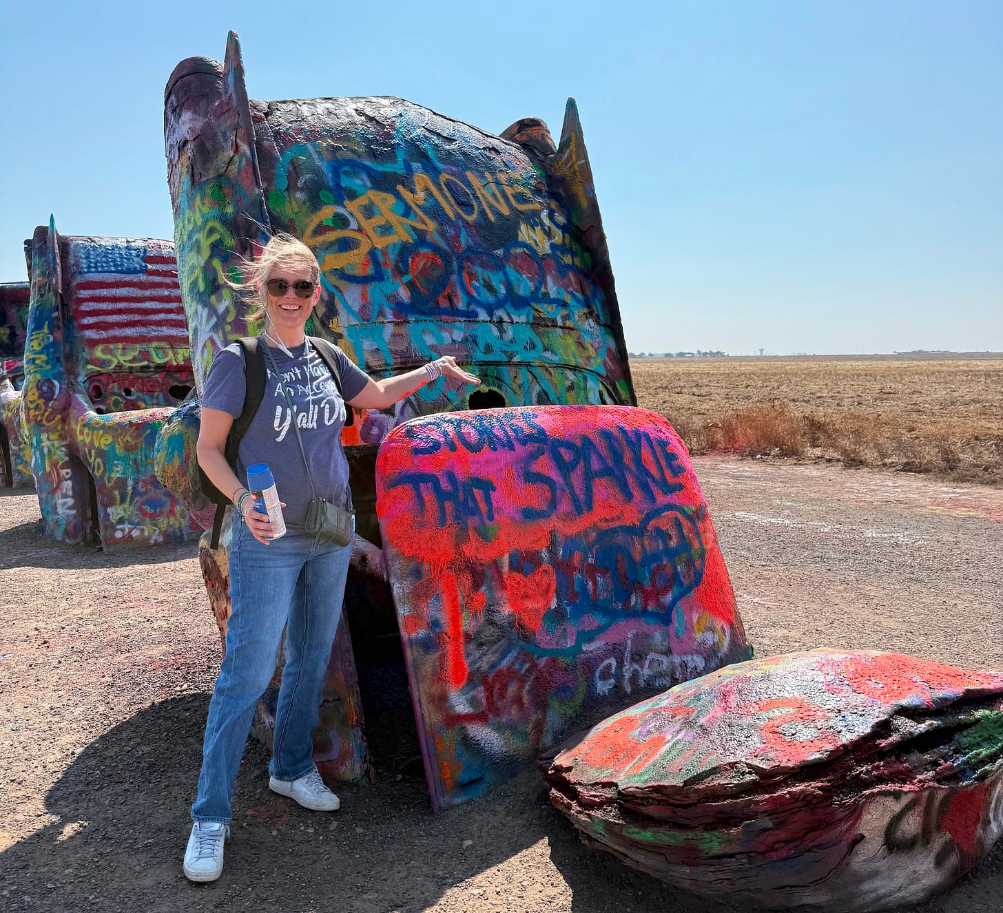 On my trip, I did not make any of the usual stops you would expect on this kind of a cross-country road trip. I did not have barbecue in Memphis. I did not go into Chicago proper. I did not go visit the Plaza in Santa Fe. I didn’t even go into Lincoln, NE—I only stopped there on my way to the small town of Plattsmouth. (true confessions: I did go to the Rock and Roll Hall of Fame in Cleveland and the Cadillac Ranch in Amarillo so…) Sightseeing in the usual sense was not the point of this trip. The point of this trip was the people—the women I recorded with, the men and women that I visited or spent time with who were not part of the podcast project, and the total strangers I met and talked to along the way.