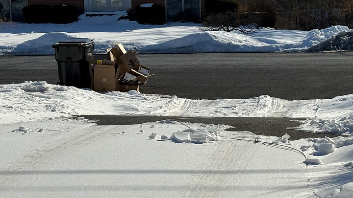 My feet, covered in my indoor slippers, slide across the ice. To keep my balance, I shuffle along, seek respite in the exposed asphalt patch in the middle of the driveway until I reach the roughed up dents aka tire tracks in the snowcrete. Without a coat on, my arms and legs begin to shiver while my gloves keep my fingers nimble. I continue, up and down, back and forth, and add to the growing mound of cardboard recycling next to the garbage can cart.