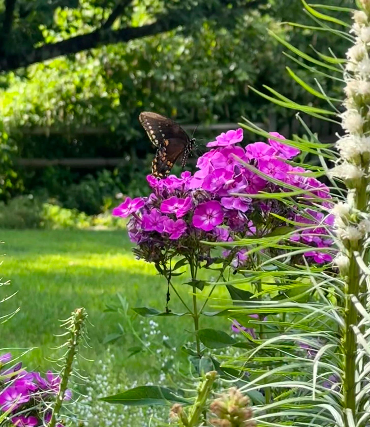 My toes wiggle on top of the wall. My back leans deeper into the chair. Off in the distance, two monarch butterflies dance together above the sunflowers. Again and again, they swoop down, and, in a circular motion, they zoom back up into the sky. In the flower bed on the other side of the wall where I sit, the tall, purple coneflowers frame in the fuchsia garden phlox. Out of nowhere, the Black Butterfly appears. It flies around my head a few times, and then settles onto one of the phlox blooms right in front of me. Patiently, it drinks the nectar, and slowly, opens and closes its wings.