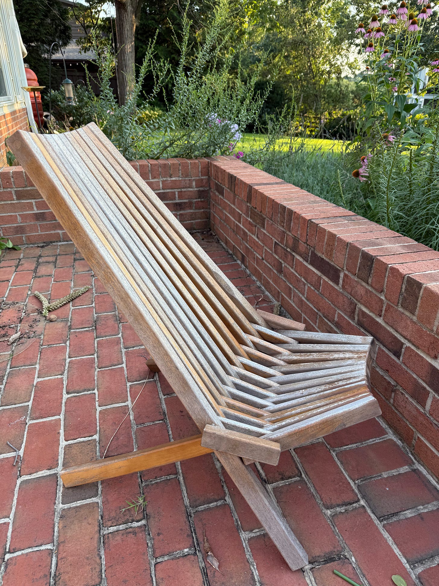 I get up, walk out to the back patio, and pull my Costco wood chair thingy majiggy up to the little brick wall along the edge of one of my pollinator gardens. The chair, weather-worn to match the untidy (aka messy) patio, is very low to the ground and much more comfortable than it looks. The sun hovers behind the trees in that perfect angle so it does not hit your eyes while it illuminates the whole back yard with patches of bright light in between shadows cast by the full, leafy trees. It is an awesome 78 degrees with no real humidity. And, crucially, there are no bugs.