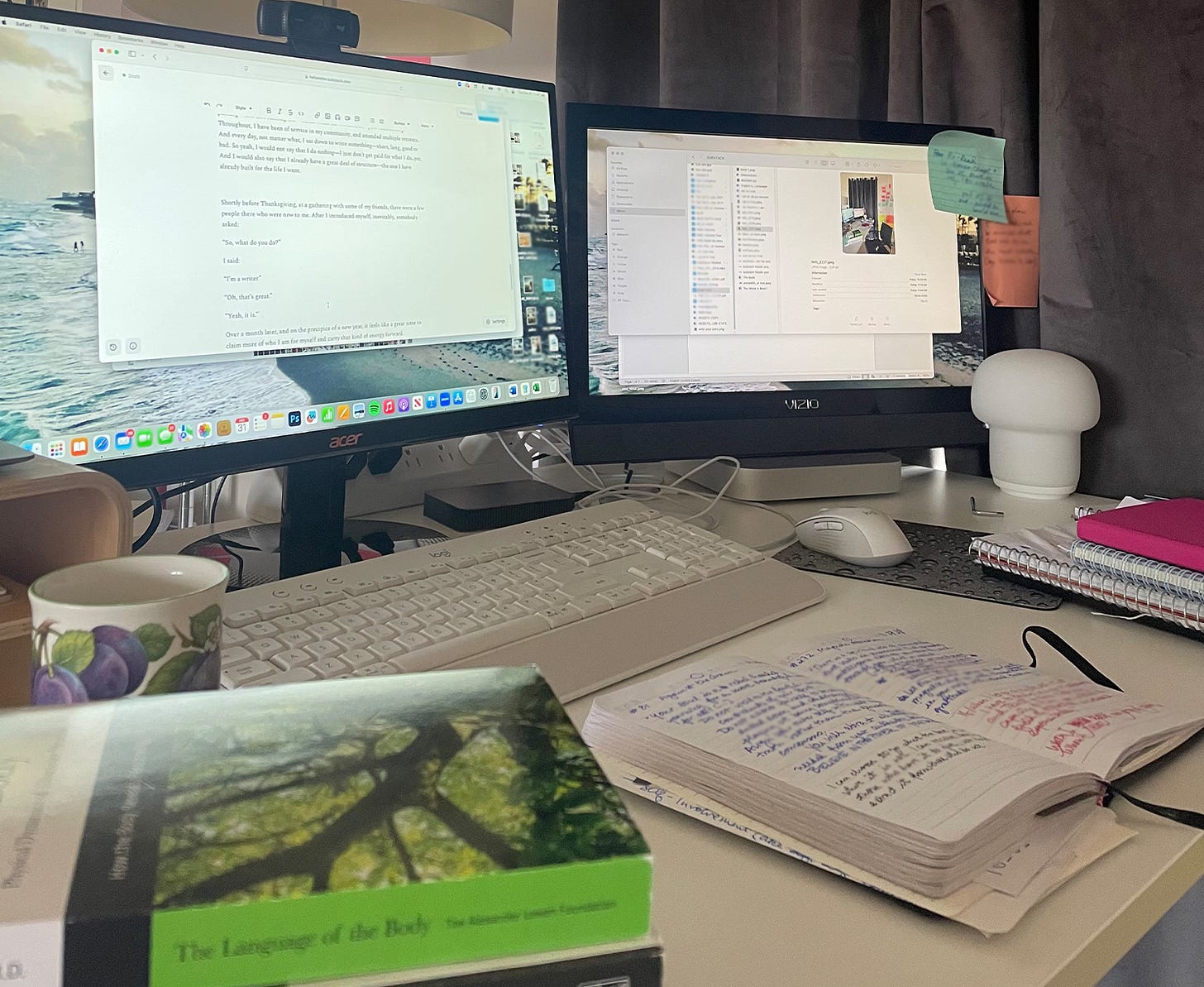 Third, and most importantly, I did not like saying “I do nothing” because it felt disingenuous. Really, it felt…dismissive. Because in fact, I do a lot. Since the start of September, I re-wrote, re-read, and re-edited my book (twice). In October, I started a four-year training program in support of a new career while I continue to travel to see my dearest friends near and far. Meanwhile, I continued to grieve Barbara’s passing and healed more of the wounds I still have from my failed 20+ year marriage. Throughout, I have been of service to my community, and attended multiple retreats in service to myself. And every day, not matter what, I sat down to write something—short, long, good or bad. So yeah, it’s not that I do nothing—I just don’t get paid for what I do…yet.