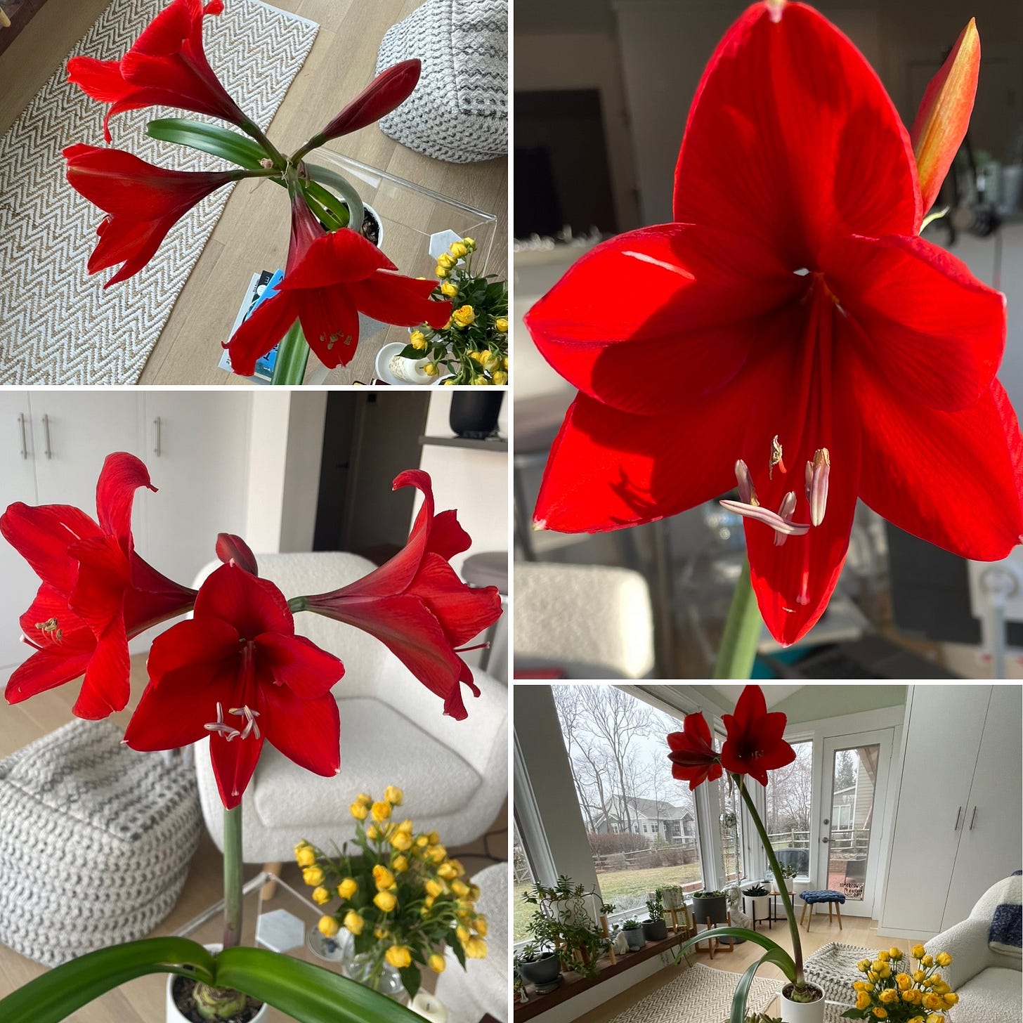 A few weeks ago, it was bitter cold outside. Bundled up, I went into the backyard and refilled the birdfeeder. When I came back inside, and like I have done many times before, I walked past that planter. For no good reason, I grabbed it and placed it on the counter between my kitchen and the sunroom. Then I removed the flakiest bits off the top of the bulb and watered it. Every week. And then it grew. And grew. And grew. Huge. The two leaves, thick, massive, and arched, opened wide like two arms ready for an embrace. And the stem, thick and long, stretched toward the sun with such vigor, the visible part of the bulb tilted along with it.
